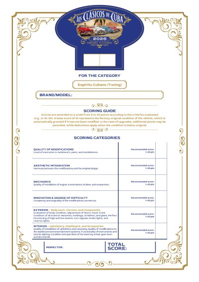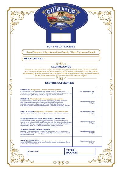 Welcome to the prestigious Los Clásicos de Cuba event, where we celebrate the beauty and uniqueness of classic cars! Every vehicle tells a story, reflecting Cuba’s rich automotive tradition. During the competition, the jury will evaluate each automobile’s design, paintwork, maintenance, and distinctive details.