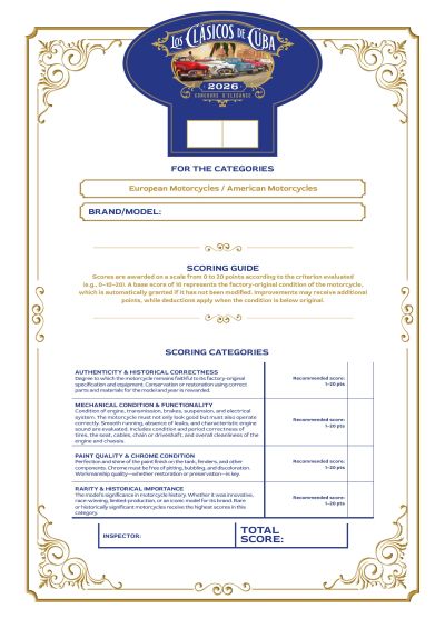 If your motorcycle embodies freedom, power, and the untamable spirit of the open road, this is where it belongs! In this category, we pay tribute to iconic Harley-Davidsons, Indians, and other North American legends that represent rebellion, authenticity, and the pursuit of limitless horizons. Show off your American style and let it shine under the Havana sun.